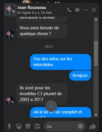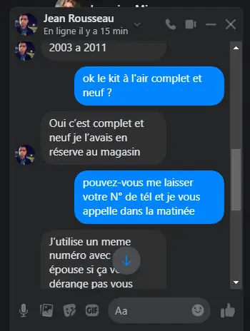 | ok le kit à l’air complet et neuf ? Oui c’est complet et neuf je l’avais en réserve au magasin | pouvez-vous me laisser votre N° de tél et je vous appelle dans la matinée J’utilise un même numéro avec mon épouse si ça vous dérange pas vous pouvez me joindre par Mail ou même ici si vous voulez je préfère par tél c’est plus simple |
