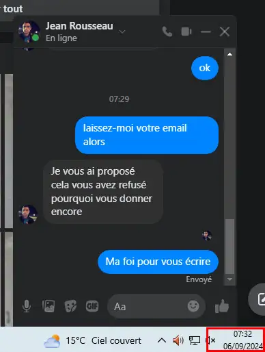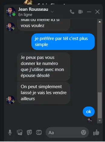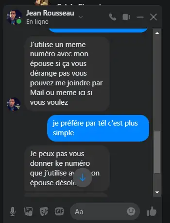 Je peux pas vous donner ke numéro que j’utilise avec mon épouse désolé On peut simplement laissé je vais les vendre ailleurs | Le 06/09/2024 à 07.32 H | laissez-moi votre email alors Je vous ai proposé cela vous avez refusé pourquoi vous donner encore Ma foi pour vous écrire | Vous n’êtes pas déjà entrain de le faire là ? |