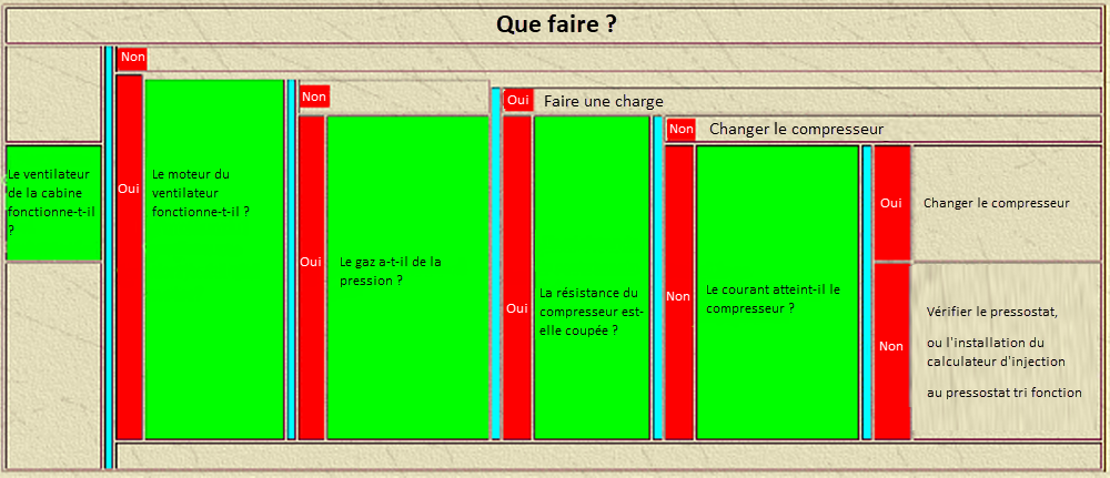 * Si vous séparez le GMV moteur, le compresseur est découplé et le GMV habitacle continue de fonctionner, le problème se situe entre la sonde de température de l’évaporateur, une charge défectueuse du gaz fréon et le boîtier de résistance.