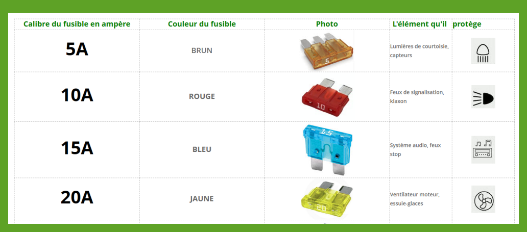 Le meilleur moyen pour connaitre l’ampérage associé à un fusible spécifique est de vérifier le chiffre inscrit directement sur son corps en plastique. Cet ampérage peut varier