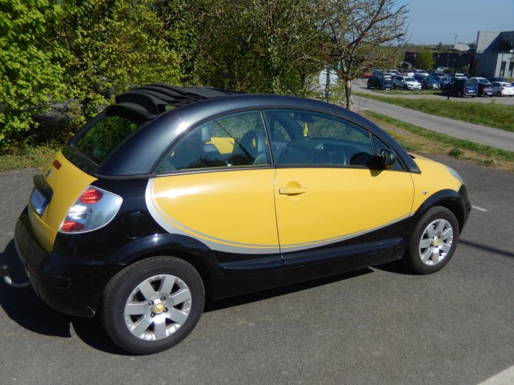 Et oui c’est une C3 PLURIEL CHARLESTON par ses couleurs jaune hélios et noire , comme l’avait été la série des 2 CV CHARLESTON année 80, Citroën l’a produite avec les couleurs rouge et noire sur la C3 Pluriel.