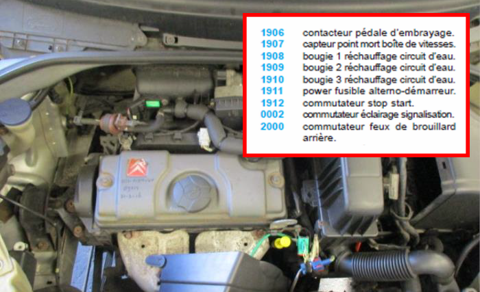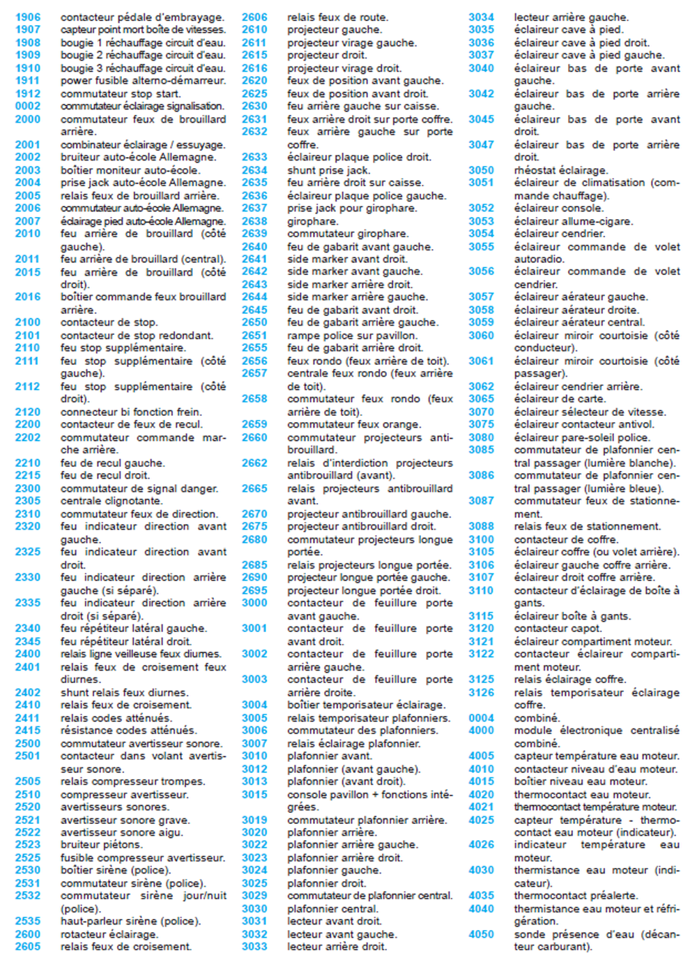 Liste complet des codes et références des équipements électrique C3 Pluriel de 1906 à 4050 Voici la codification des abréviations La suite pour la page 5 sur 11 Please leave this field empty Pour aller plus loin, Inscrivez-vous pour recevoir les nouveaux articles dans votre boite de réception. Je hais les spams votre adresse email ne sera jamais cédée ni revendue. En vous inscrivant ici, vous recevrez des articles, vidéos, offres commerciales et autres conseils pour vous aider pour votre C3 Pluriel. Vous pouvez vous désabonner à tout instant. politique de confidentialité Vérifiez votre boite de réception ou votre répertoire d’indésirables pour confirmer votre abonnement. Please leave this field empty Oh bonjour 👋 Ravi de vous rencontrer. Inscrivez-vous pour recevoir les nouveaux articles dans votre boite de réception. Sélectionner une ou plusieurs listes : Liste de diffusion de newsletter Je hais les spams votre adresse email ne sera jamais cédée ni revendue. En vous inscrivant ici, vous recevrez des articles, vidéos, offres commerciales et autres conseils pour vous aider pour votre C3 Pluriel. Vous pouvez vous désabonner à tout instant. politique de confidentialité Vérifiez votre boite de réception ou votre répertoire d’indésirables pour confirmer votre abonnement. Entrées similaires: Opérations à effectuer après une intervention Liste complet des codes et références page 6 Liste complet des codes et références page 7 Liste complet des codes et références page 8 Submit a Comment Cancel replyYour email address will not be published. Required fields are marked *Comment * Name * Email * Website Save my name, email, and website in this browser for the next time I comment. Oui, ajoutez-moi à votre liste de diffusion.