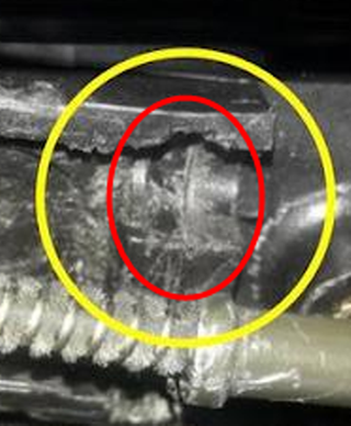 Lors de l’ouverture et la fermeture de la capote, les gaines se déplacent légèrement sous l’effort et finissent pas user le plastique (cercle jaune).