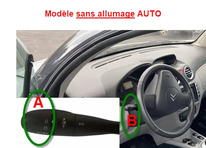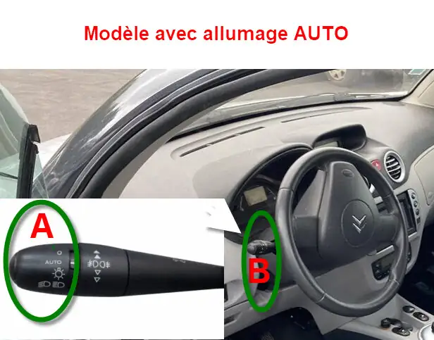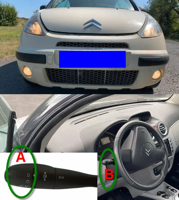 L’éclairage est commandé par le levier situé à gauche du volant ( comme pour cet exemple en France ).