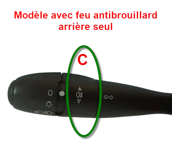 | FEUX ANTIBROUILLARD ARRIÈRE 4 Tournez la bague centrale du levier vers l’avant. Le fonctionnement n’est possible que si les feux de croisement ou de route ont été sélectionnés au préalable. L’allumage est signalé par l’allumage d’un témoin lumineux au combiné d’instruments | ||||