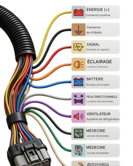 Faisceau de câbles avec code couleur et symboles expliquant la fonction de chaque type de conducteur utilisé dans les systèmes électriques du véhicule.