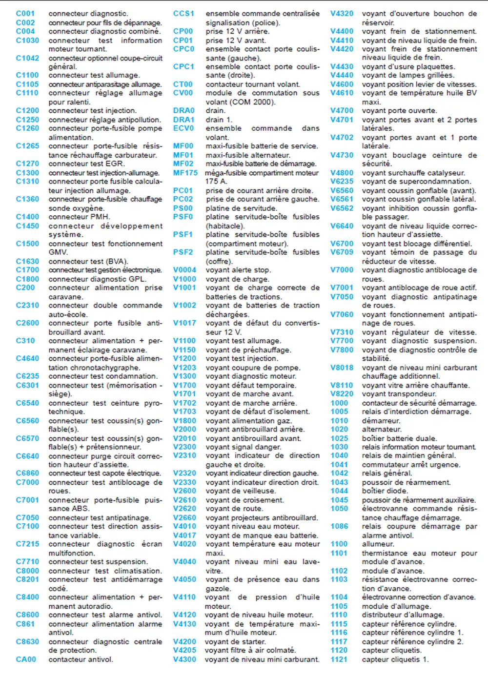 Liste complet des codes et références