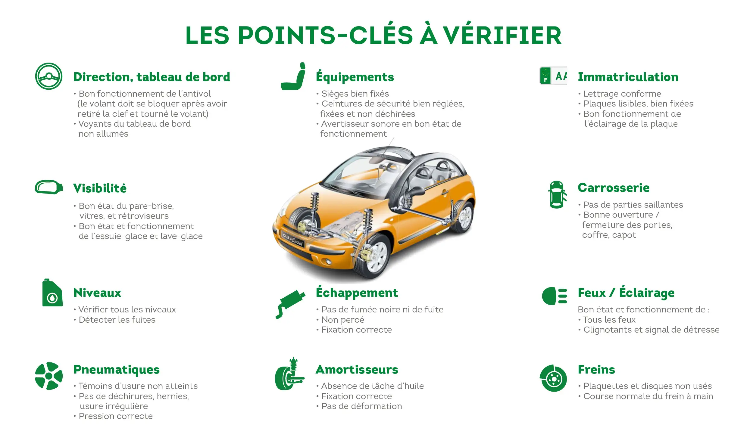 Lors du passage du véhicule entre les mains du contrôleur, les points suivants font l’objet de vérifications :