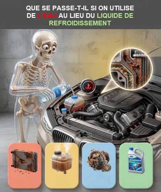 Il est déconseillé d’utiliser de l’eau à la place du liquide de refroidissement, car cela entraîne une surchauffe du moteur, des risques de corrosion et de casse mécanique due au gel.